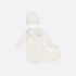 Crafted from premium ivory jersey and cotton poplin, each piece is delicately adorned with gold-tone star and Dior embroideries, symbolizing purity, elegance, and a touch of celestial charm. The bodysuit features a ruffled round collar, enhancing its delicate, classic silhouette, while a back and inseam snap placket ensures effortless dressing and diaper changes. The matching bib and beanie complete the set, each elevated with gold-tone embroidery, adding a refined and luxurious House signature.