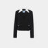 Designed with straight, clean lines, this structured wool jacket is a timeless piece that offers both versatility and elegance. The contrasting satin collar creates a striking visual appeal, while the jewel-adorned pocket buttons add a hint of glamour.