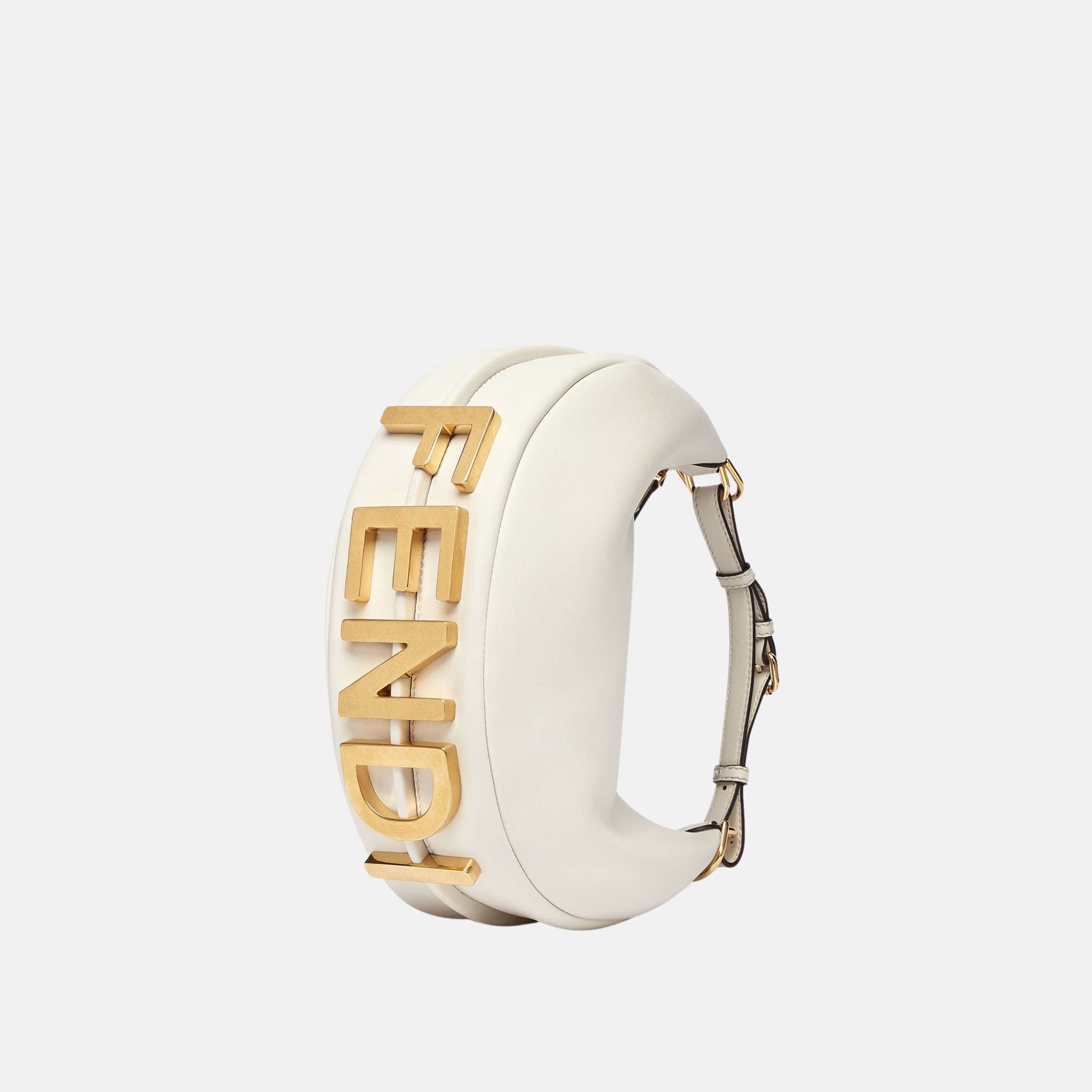 The Fendi Fendigraphy Small Bag In Leather is a chic and contemporary hobo bag, designed with fluid lines and bold branding. Crafted from supple brown calfskin, this bag is elevated with vintage gold-tone FENDI lettering, which becomes prominently visible when worn under the arm. Its ergonomic, curved shape makes it an effortlessly stylish and comfortable accessory, perfect for day-to-night wear.